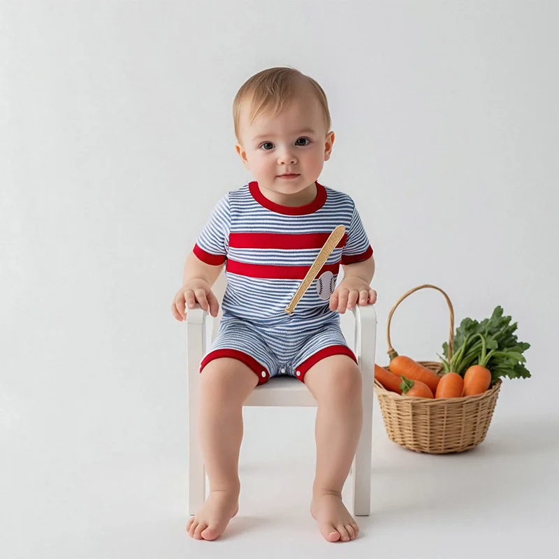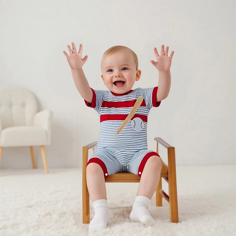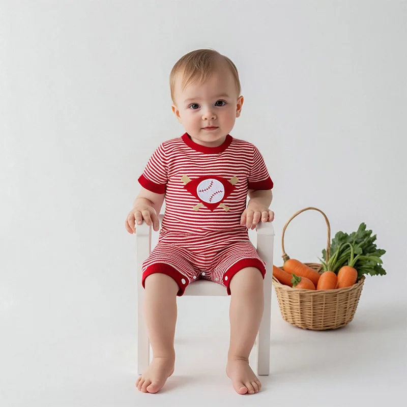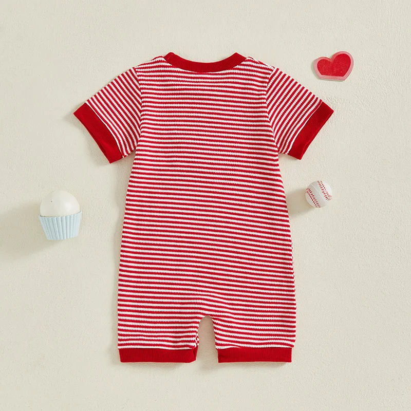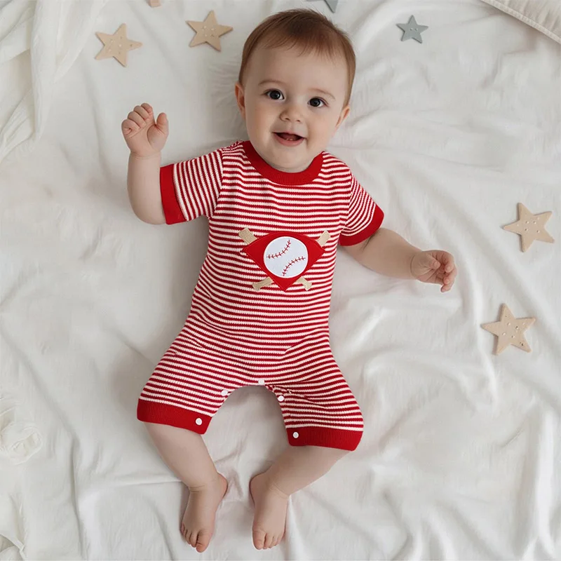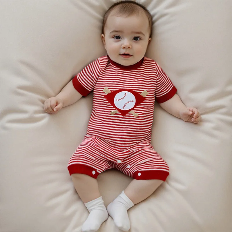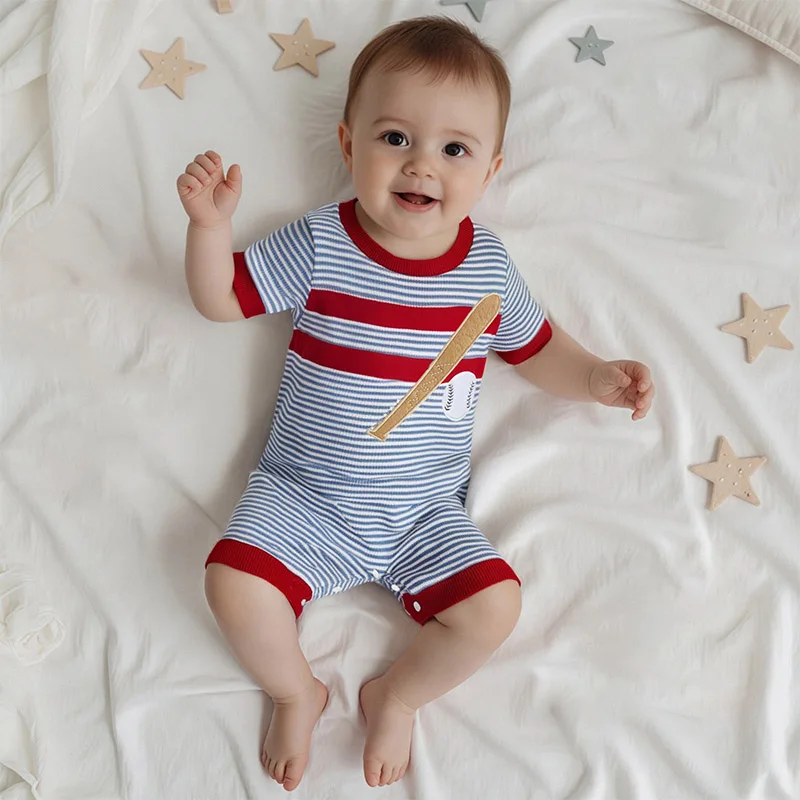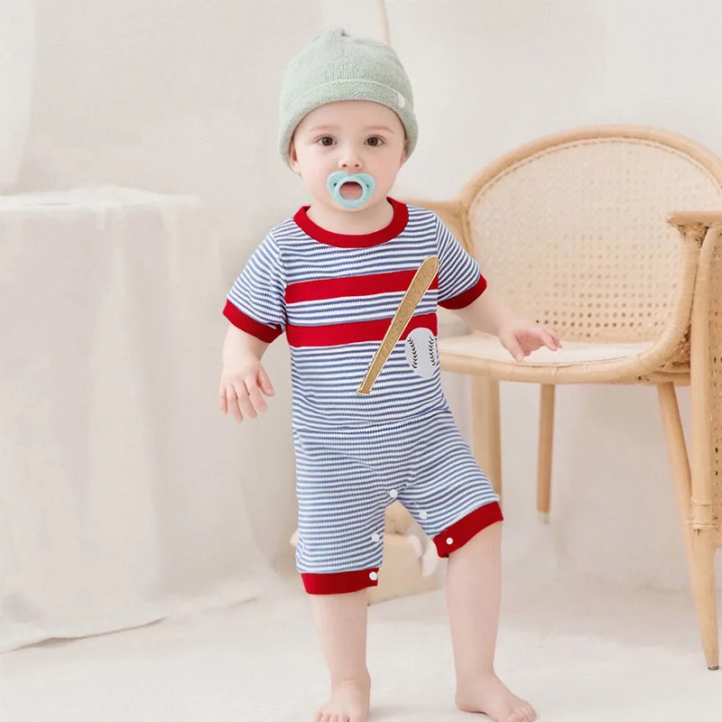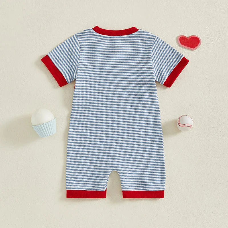 Baby Boy Baseball Embroidered Romper Striped Short Sleeve Waffle Knit Bodysuit Casual Summer Clothes